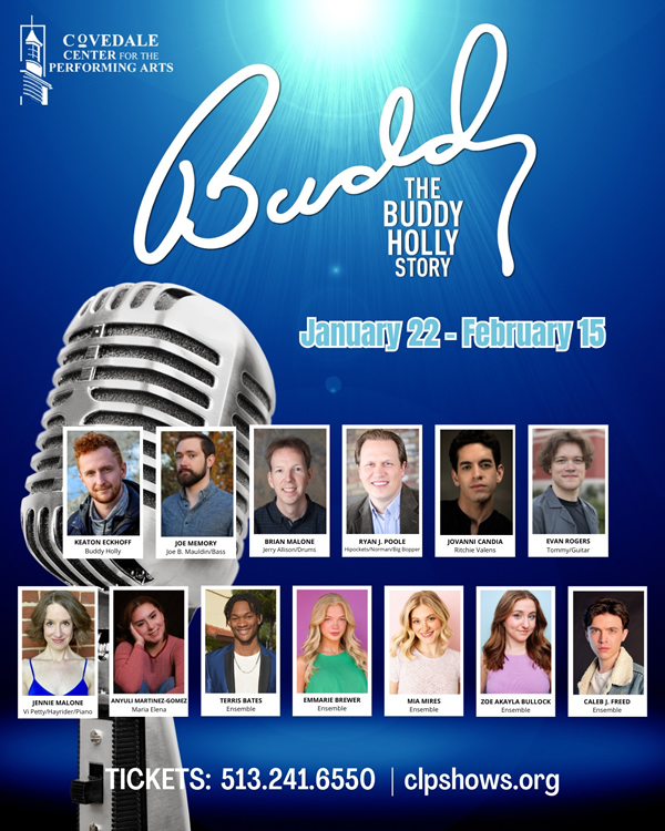 The Cast: Keaton Eckhoff (Buddy), Joe Memory (Joe Mauldin/Cricket (Bass), Brian Malone (Jerry Allison/Cricket (Drums), Evan Rogers (Cricket (Rhythm Guitar), Ryan J. Poole (Hipockets/Norman/Big Bopper, Jovanni Candia (Richie Valens), Jennie Malone (Vi Petty/Hayrider/Piano, Anyuli Martinez-Gomez (Maria Elena), Terris Bates (Apollo Performer/Dancer), Emmie Brewer (Dancer/Dance Captain), and dancers including Mia Mires, Zoe Bullock and Caleb Freed